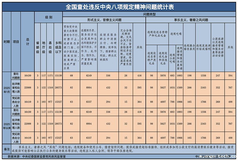 二十届中央纪委四次全会提出,“锲而不舍落实中央八项规定精神,一严到底纠治‘四风’”。图为2025年2月26日,中央纪委国家监委公布的2025年1月全国查处违反中央八项规定精神问题统计表,这是连续第137个月公布月报数据。 中央纪委国家监委新闻传播中心供图