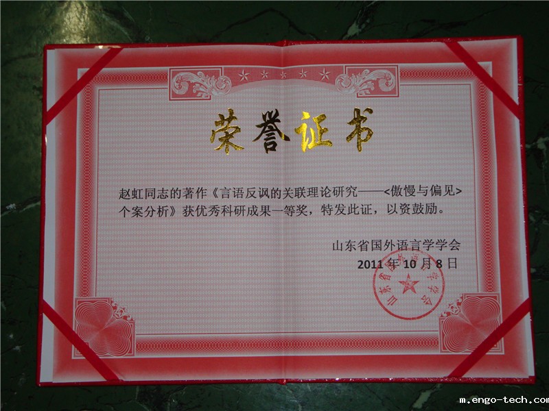 (通讯员 莫振银)在2011年10月8日于山东大学举行的当代语言学研究国际研讨会暨山东省国外语言学学会第十二届年会上,我院赵虹博士的专著《言语反讽的关联理论研究——〈傲慢与偏见〉个案分析》荣获优秀科研成果一等奖。